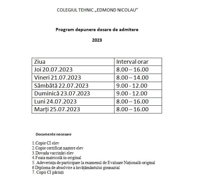 | 19.07.2023 | Program depunere dosare de admitere 2023 | Deschide |