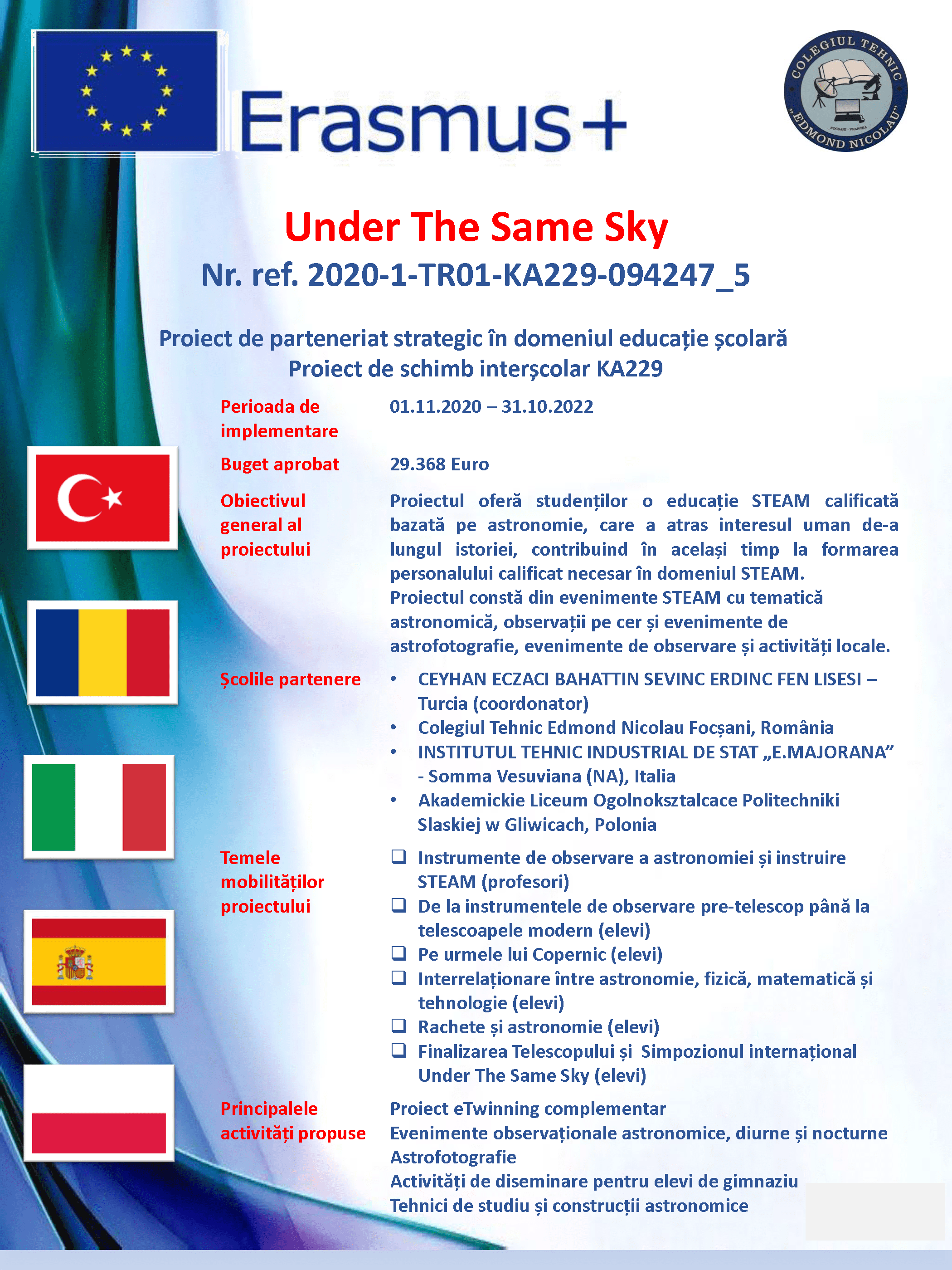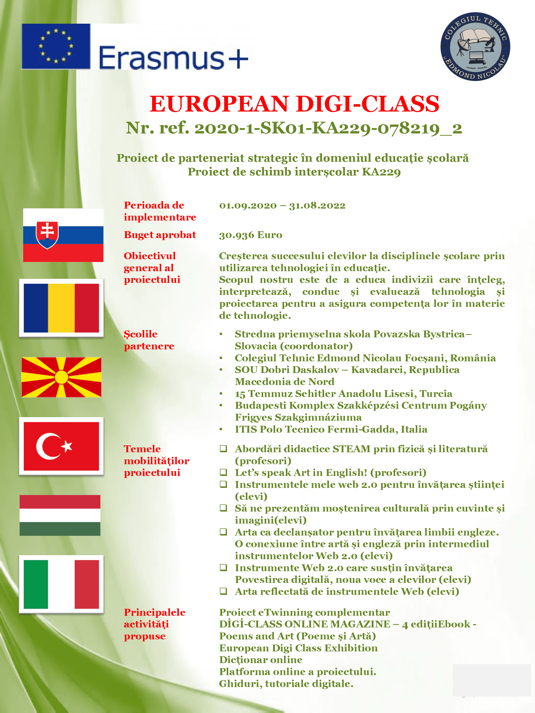În urma aprobării proiectului de parteneriat strategic pentru educație 2019-1-RO01-KA201-063169 „SCIENCE CONNECT”, în cadrul Programului Erasmus+ Acțiunea cheie KA2 - Parteneriate strategice pentru susţinerea inovării, COLEGIUL TEHNIC EDMOND NICOLAU din Focșani anunță organizarea selecției pentru: