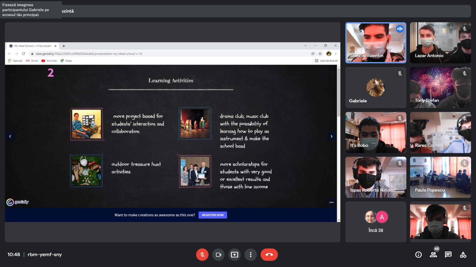 Profesorii au fost, de asemenea, implicați în mobilitate și au intervenit vorbind despre sistemul lor școlar ideal, referindu-se în special la abordări didactice moderne și metode de predare prin care achiziția noilor cunoștințe să fie mai eficientă, mai ales în perioada de pandemie. În a cincea zi, elevii au ilustrat câteva dintre aplicațiile educaționale, precum Padleț, Genial.ly, Wakelet, Prezzi, Book Creator și platformele de e-learning pe care le folosesc în școlile lor (Adservio, Edmodo, Google Classroom). Apoi, cei 48 de elevi au fost implicați într-un quiz Kahoot despre personalități internaționale care au marcat domeniile științific și artistic. Mobilitatea virtuală s-a încheiat cu feedbackul oferit de elevi prin intermediul aplicației Mentimeter.
